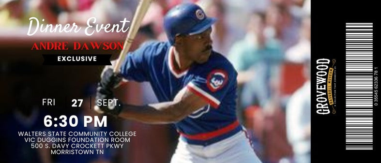 This Dinner Event at Walters State Community College will take place Friday September 27, 2024, 6:30pm. Limited to 80 attendees, dinner will be provided, and includes a Q&A with Andre about his life and career, as well as a Meet-n-Greet opportunity for a photo and autograph.